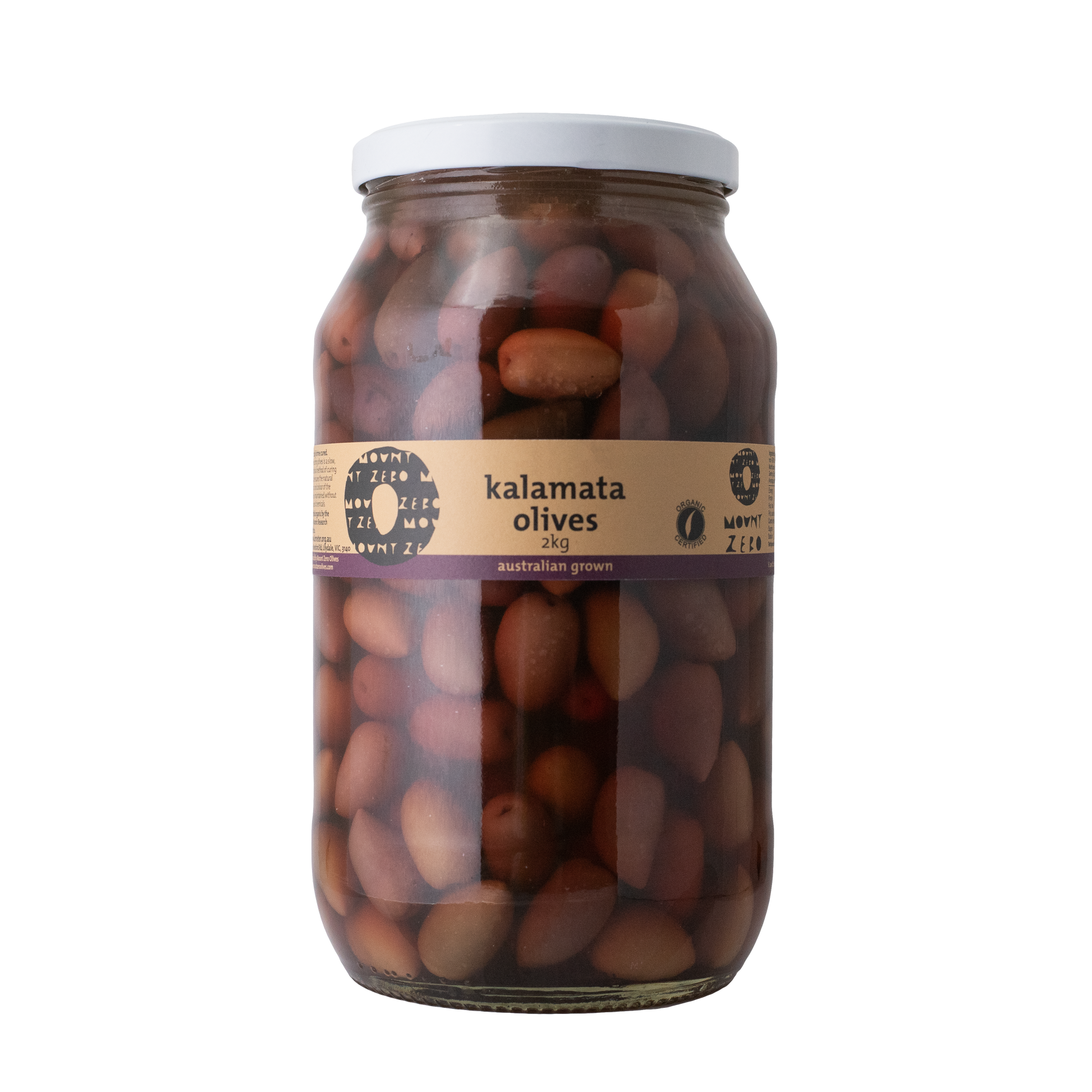 Mount Zero Kalamata olives are medium/large in size. They have a firm flesh, complex olive flavour and finish with a delicious bitterness. Kalamata olives are the classic table olive variety and are also fantastic in salads. These olives are hand-picked and naturally brine-cured, which provides for the variation in colour and a flavour that can only come from time-consuming natural fermentation.