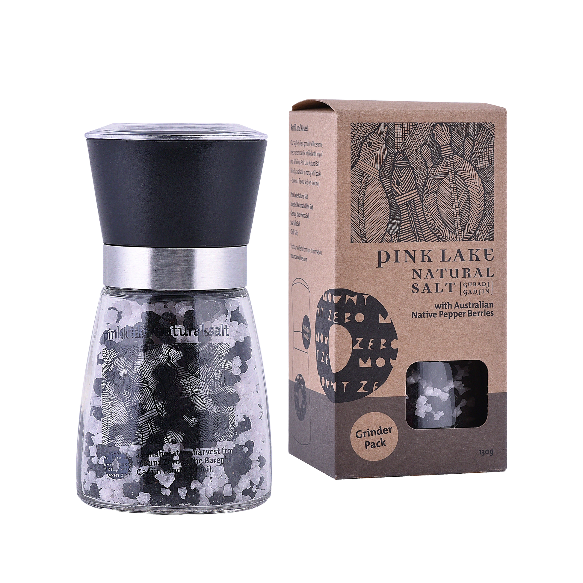 Our signature Pink Lake Salt, mixed with native Australian pepper berry and housed in a refillable and reusable grinder.